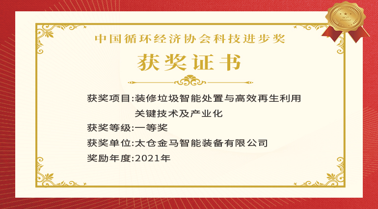 金馬裝備榮獲“中國循環(huán)經(jīng)濟協(xié)會科學(xué)技術(shù)獎一等獎”